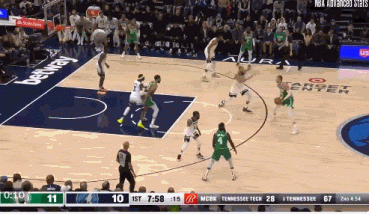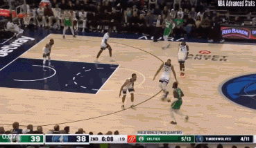 镜头六:迈克丹尼斯全场领防塔图姆,后者压力之下出现失误,直接被打反击;