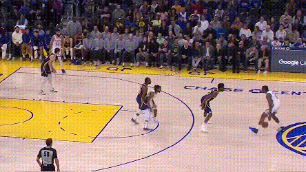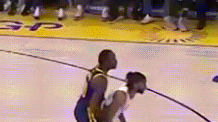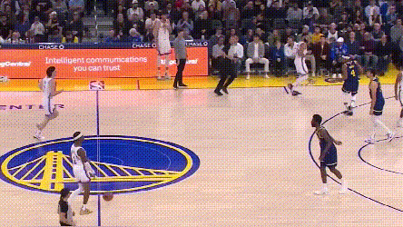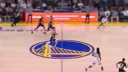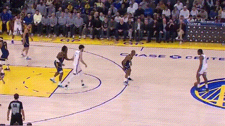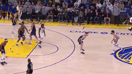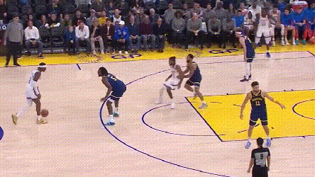 另外,库明加这场的防守有进步,主要是策略对他友好一些,他可以无脑 换防。从这里也能看出,老将们跟他打不到一块去。比如下面这次,维金斯完全没有想换的意思,因为这个位置勇士过去确实一般不换。但库明加换防了,这就让维金斯的不换成了漏洞。
