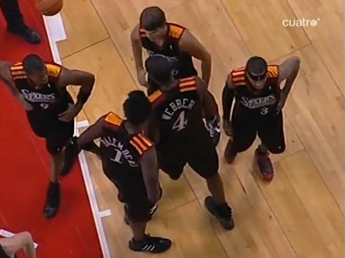 76人的球员们到底有多么不认真,不得而知。我们只知道这场季前赛是大卫-斯特恩向欧洲大陆推销NBA的一部分,阵容上没什么伤没什么病的,都得上场露两手。所以,阿伦-艾弗森上了,克里斯-韦伯上了,凯尔-科沃尔、安德烈-伊戈达拉、达勒姆波特都没缺阵,76人也在两个半场的开头都曾领先过两位数。