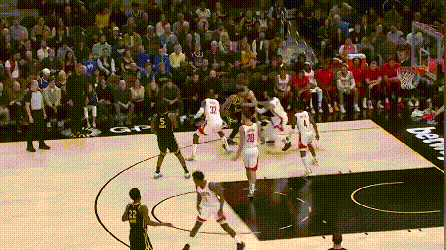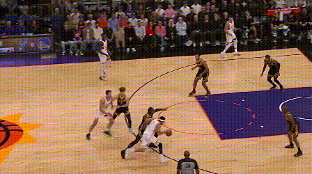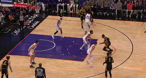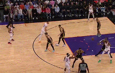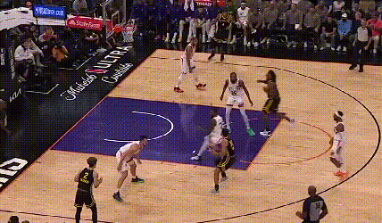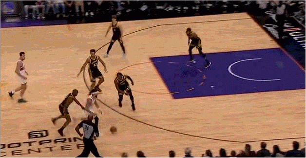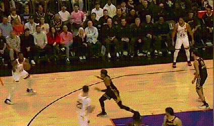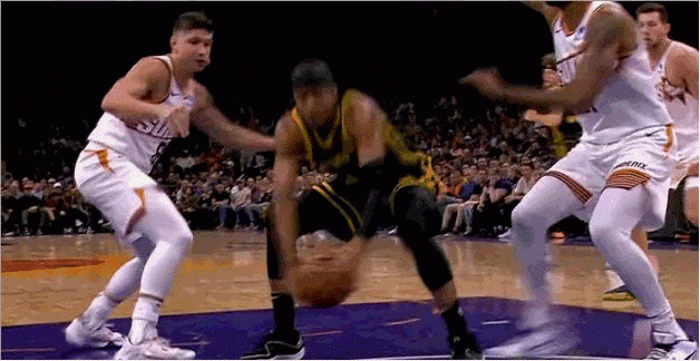 由于勇士内线约等于没有护筐,对于外线防守“不被过”这件事就格外看重。穆迪被一个生涯三分命中率33.3%的球员晃起,导致中路防线大开,这在勇士的防守体系里是要重判的。在勇士,防定点可以让对手投进三分,但不能被过,所以,勇士球员扑防定点的正确姿势是,先减速收重心接滑步,过程中根据进攻球员选择,再决定扑防还是跟住对手的突破,比如: