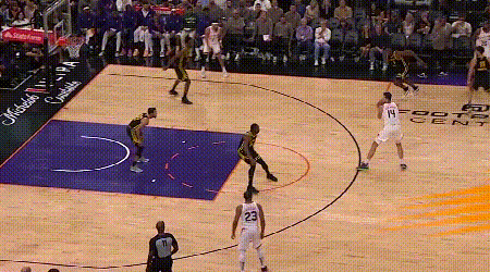 穆迪得寻找下一次机会——机会很快就来了。这个回合之后,回到防守端,布克突破库明加杀向油漆区,穆迪赶到协防位置,成功护筐,但代价是鸡飞蛋打。