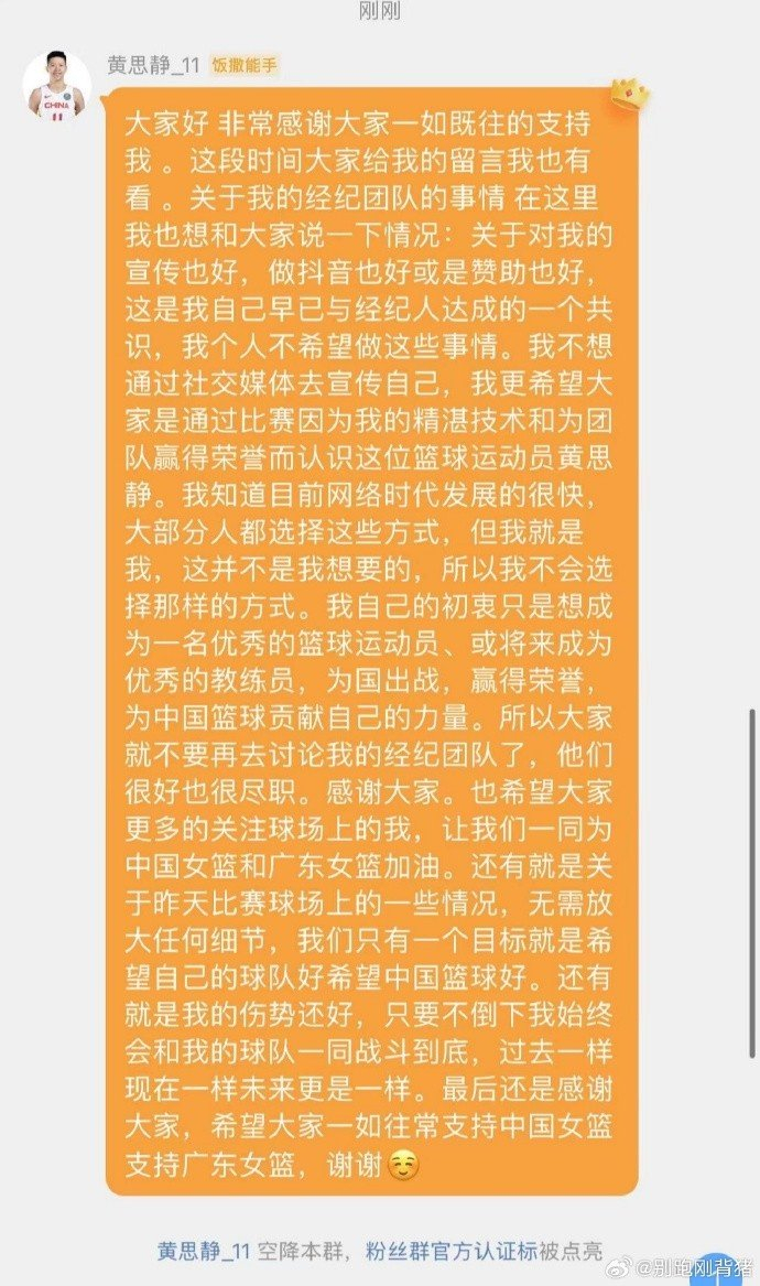 直播吧11月27日讯 媒体人@别跑刚背猪分享了黄思静在微博群发的一条长文。