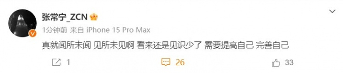 赛后,吴冠希妻子张常宁更博写道:“真就闻所未闻,见所未见啊,看来还是见识少了,需要提高自己,完善自己。”