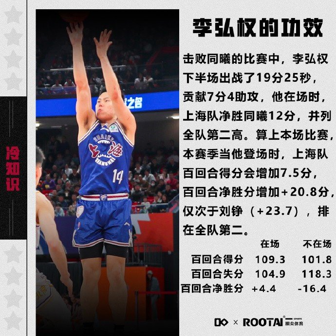 “上海男篮有惊无险击败同曦,在下半场登场的李弘权可以算得上是本场比赛的奇兵,他在场时,上海队净胜同曦12分。