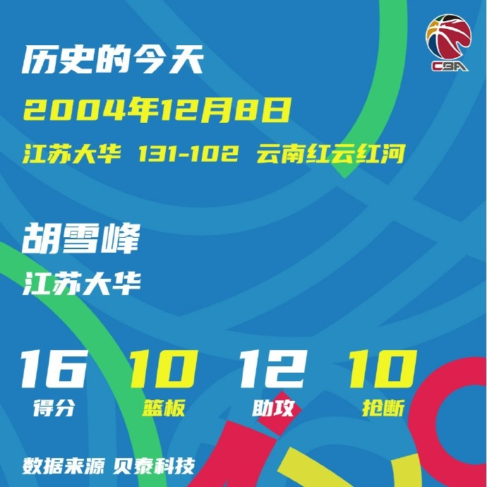 直播吧12月8日讯 今天,CBA官方晒出“历史上今天”专题的一组数据,具体如下: