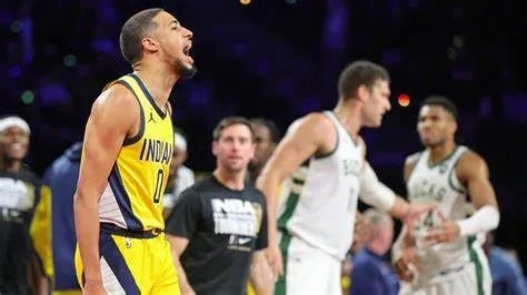 今天就是如此:第二节,雄鹿刚得分,哈利伯顿接底线传球,急速快传给托平上空篮;下一回合,托平一个三分球。