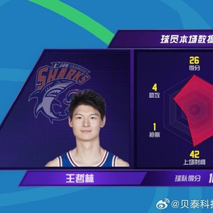 本场比赛,王哲林出战42分钟,19投11中,三分1中0、罚球8中4拿到全队最高26分11篮板外加4助攻1抢断1盖帽。