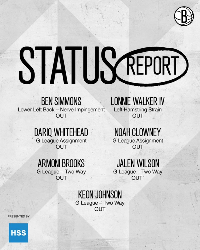 篮网官方更新社媒,发布本场比赛的伤病报告。具体缺席情况如下:
