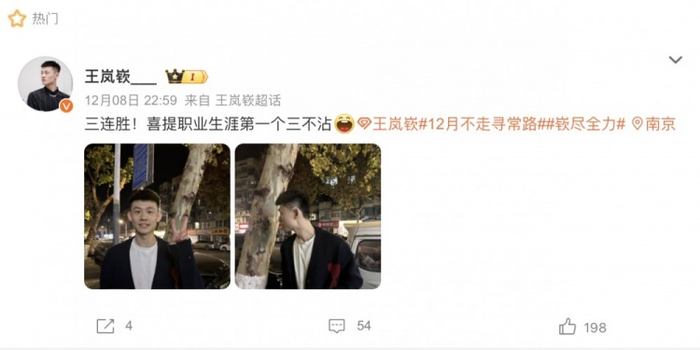 赛后,同曦队球员王岚嵚更新社媒晒个人照片,并配文“三连胜!喜提职业生涯第一个三不沾😆”。