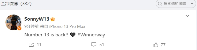 威姆斯写道:“13号要回来了!!🖤#Winnerway ”
