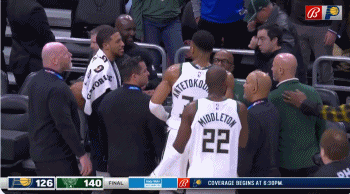 但字母哥当时看到的步行者助教拿的球是怎么回事呢?这是引发冲突的导火索。原来,比赛中并不是只有一个球,还有很多备用球,防止在比赛用球被(观众的饮料或者球员出血)弄脏的情况下替换,卡莱尔表示助教当时拿的就是备用球。