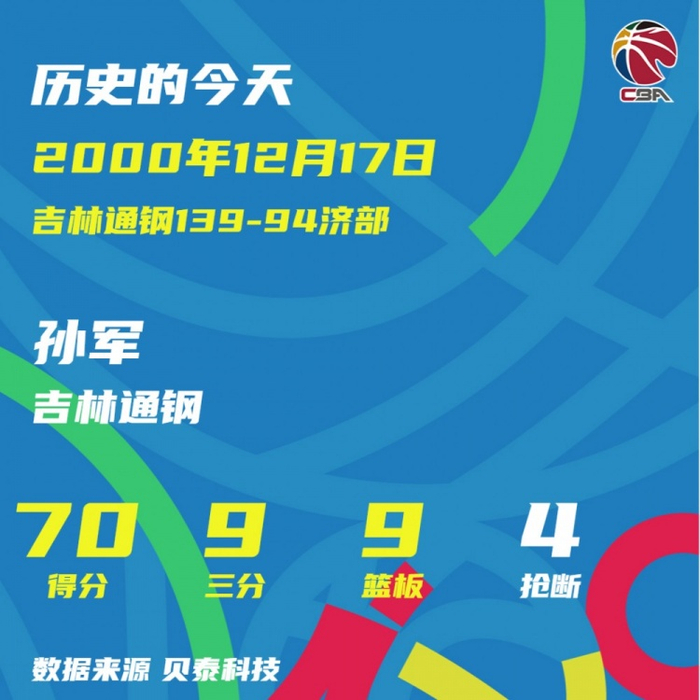 直播吧12月17日讯 CBA官博更新,回顾历史上的今天之12月7日:孙军单场70分创造本土得分纪录至今无人能破。