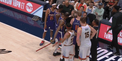 本场比赛第三节,约基奇与布朗偷听太阳战术,被杜兰特一把推开。随后,布朗与杜兰特被吹技犯。