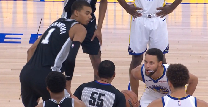比赛一开始,勇士派上了1米88的库里和马刺2米24的文班亚马跳球,稳稳没赢。
