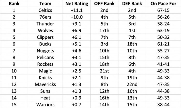 直播吧1月2日讯 美记Shane Young今日列出了截止至今净胜分前15的球队,并根据数据模型预测出了他们的最终战绩。目前凯尔特人、76人、雷霆净胜分排名前三。