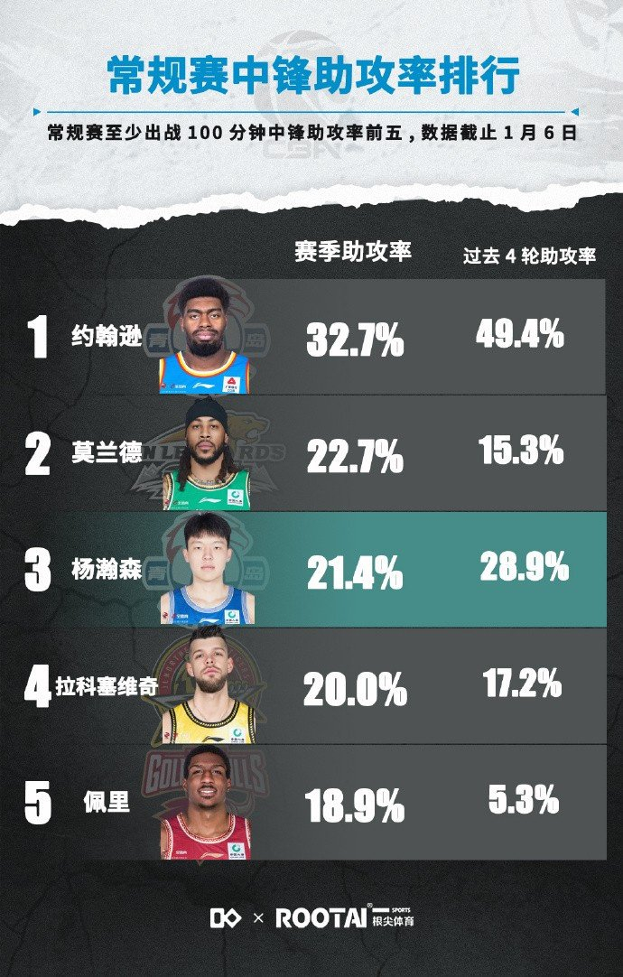 大局观!杨瀚森赛季助攻率排名目前中锋榜第三 前五唯一本土球员
