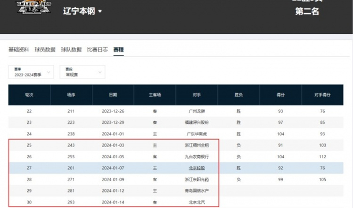辽宁队赛程的最大特点是频繁地在主客场间转换:如第25轮至第30轮、第37轮至第39轮再加第6轮补赛(详情见下图),基本是两天一场的强度,包括2月5日打完主场后,次日便要抵达南通,备战与江苏男篮2月7日的补赛。