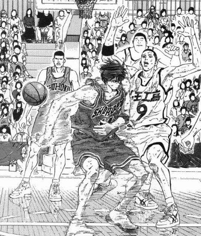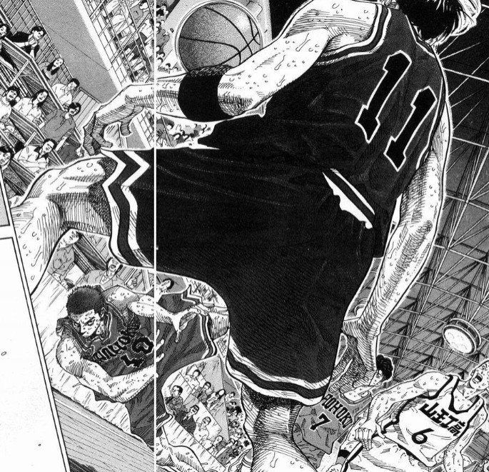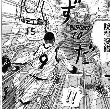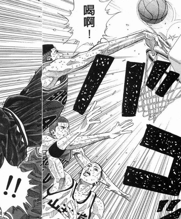——泽北被流川一对一抛射得手后,突破流川到篮下,被樱木+赤木双封盖掉。
