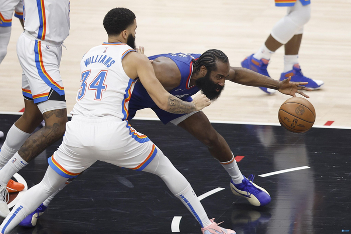 快船上分的方式很轻松:哈登+普拉姆利中路挡拆启动,连续打霍姆格伦蹲坑,哈登策动局部2打1,普拉姆利顺下吃饼空接和杀伤欺负霍姆格伦;雷霆被迫采用翼侧收缩协防中路刷卡,哈登和普拉姆利在挡拆中出球找底角曼恩接球启动袭筐;雷霆没办法,只能对哈登上提前夹击,哈登甚至在后场没过中线就遇到了双人夹击,普拉姆利策应,快船局部4打3,内切和三分多点开花。