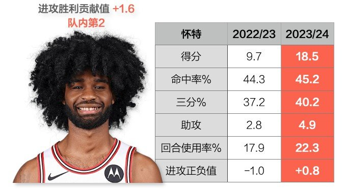 而怀特用行动证明他配得上这样的礼遇,公牛0号这赛季的回合使用率从17.9%涨至22.3%,而他在场与否,球队进攻得分的差值高达+11.4,这个数字是公牛队内断崖领先的榜首。