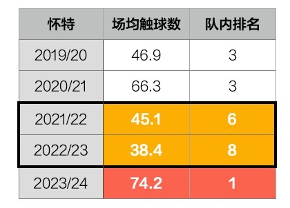 而另一项数据足以证明他在队内的战术权重不断降低。新秀赛季的怀特触球次数排名队内第3,但在生涯第四年反而掉到了队内第8......