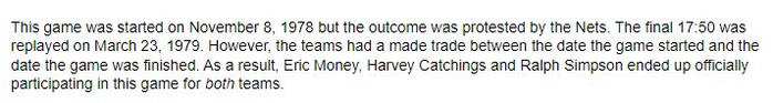 1979年3月23日,双方进行了重赛,最终篮网以117-123输给了76人。有趣的是,双方在此期间进行过一笔交易。因此,NBA历史上第一次,也是唯一一次,出现了三名球员在同一场比赛中为两支球队出战的情况(三人分别是Eric Money、Harvey Catchings和Ralph Simpson)。