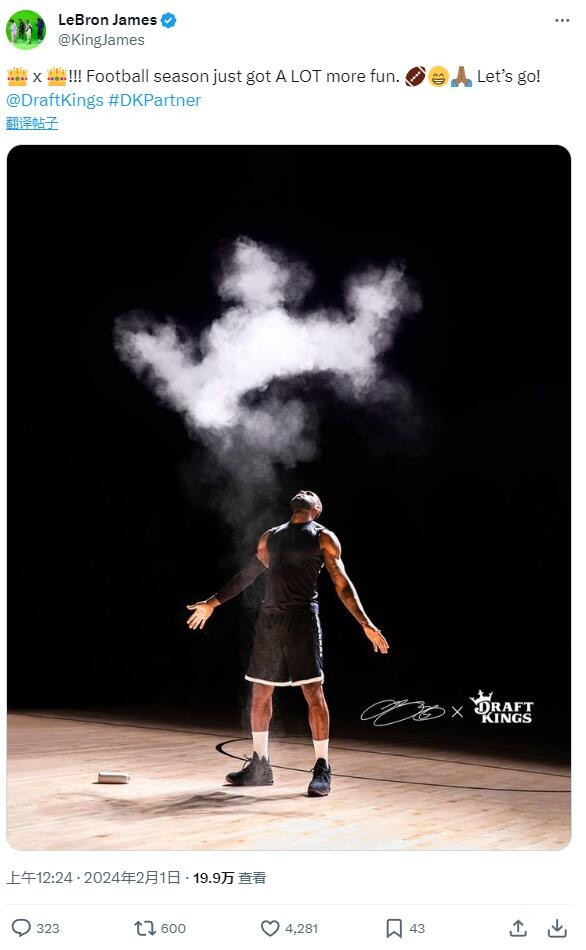 詹姆斯也更新社交媒体晒出一张撒镁粉的标志性照片,推特写道:“👑×👑!!!这个橄榄球的赛季变得更有趣了!🏈😁🙏🏾 冲啊!@DraftKings(提供体育博彩和范特西体育等服务的数字体育娱乐公司)”