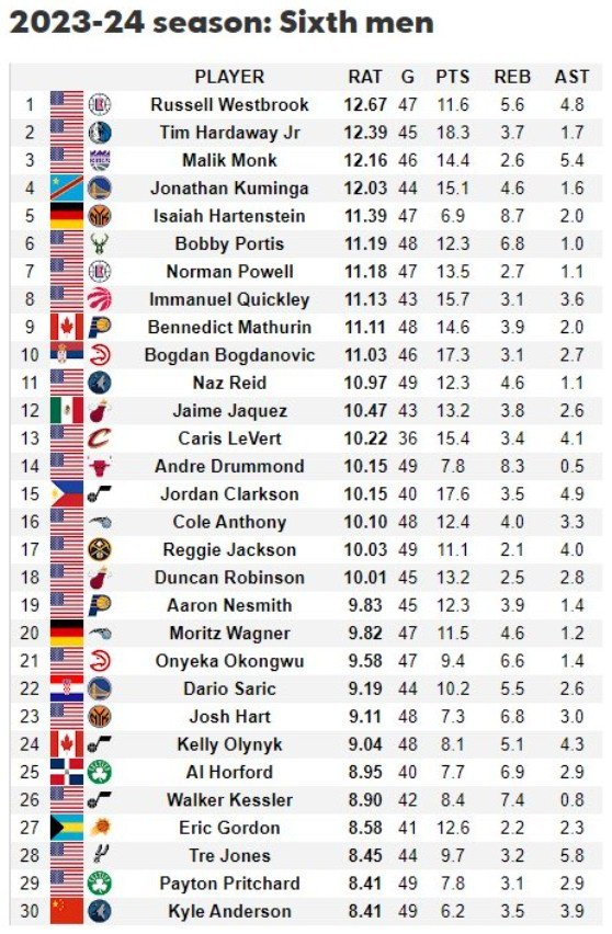 直播吧2月4日讯 美媒HoopsHype今日统计了本赛季替补球员RAT值排名,快船球星威少居首,小哈达威、蒙克、库明加分居2-4位。