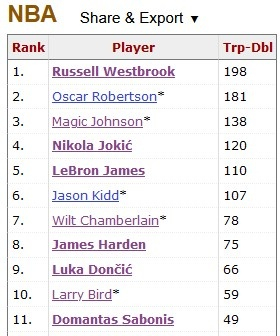 据统计,这是小萨博尼斯生涯的第50次三双,他也成为NBA历史第11位达成这一成就的球员。榜单如下: