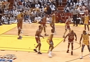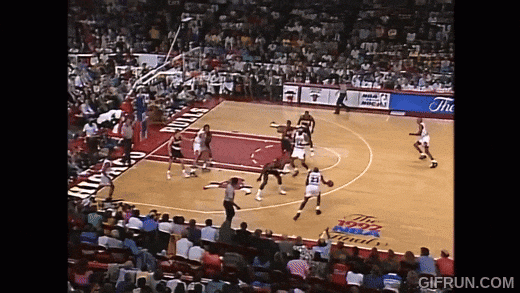 乔丹当时的传球不如魔术师大胆,但依然有足够的视野和预判。比如这一球:反击,预判到自己的突分会让对方收缩弱侧,于是给球。
