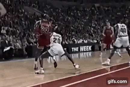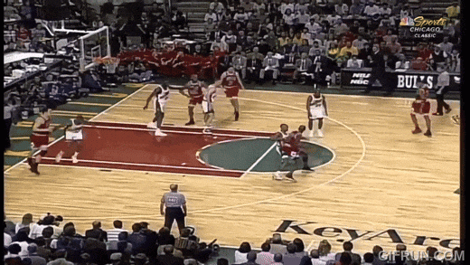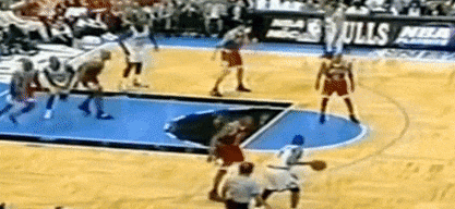当安德森从乔丹身前滚过,试图从乔丹身左抢到乔丹身前时,乔丹“好啊那就让你”,还顺手轻推一把。安德森从乔丹身左到了乔丹身右,可是一看:自己又被乔丹阻断传球线路了,乔丹还是在自己身前。