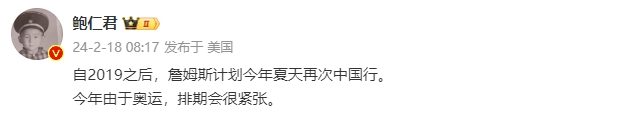 “自2019之后,詹姆斯计划今年夏天再次中国行。今年由于奥运,排期会很紧张。”鲍仁君在个人微博中写道。