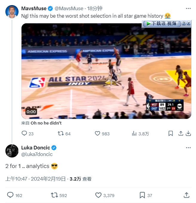 没想到东契奇在半场休息的时候还发推解释道:“这叫2for1(抢进攻机会),这叫策略懂不懂啊😎!”
