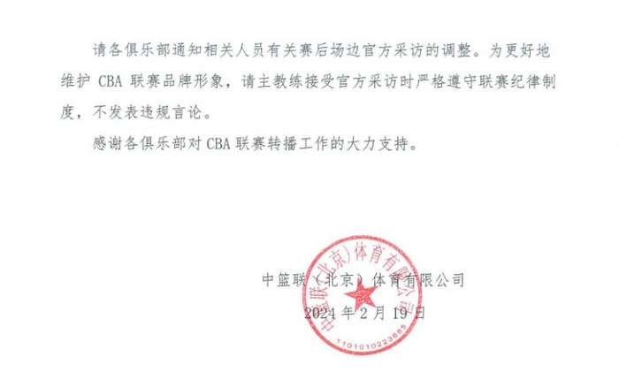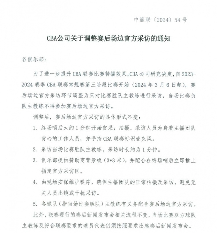 正处在“长草期”的CBA,出了个“奇葩”新规,吸引了不少眼球。2月19日,CBA调整了赛后场边官方采访通知,从第三阶段开始,只有获胜方主帅接受采访,失利方主帅不再参加赛后场边采访。同时,通知里强调,教练员接受采访时要严格遵守联赛纪律制度,不发表违规言论。