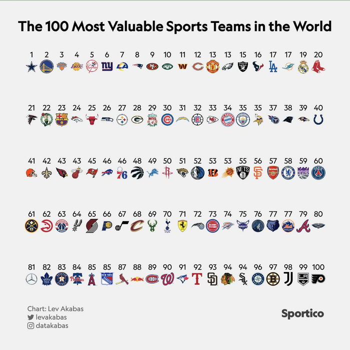 100支球队涵盖了6种体育项目、10个体育联盟,前100球队的最低标准是17亿美元。