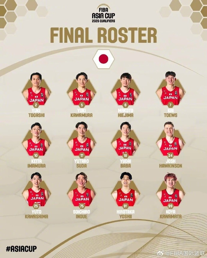 日本男篮公布中日对决12人名单:河村勇辉&比江岛慎&霍金斯在列