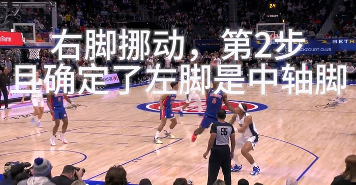 双脚落地的第1步之后,右脚挪动,算作第2步(上述规则2),且右脚挪动确定左脚为中轴脚(上述备注1):