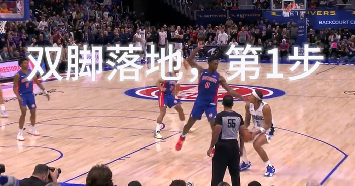 合球之后,双脚同时落地,算作第1步(上述规则1):