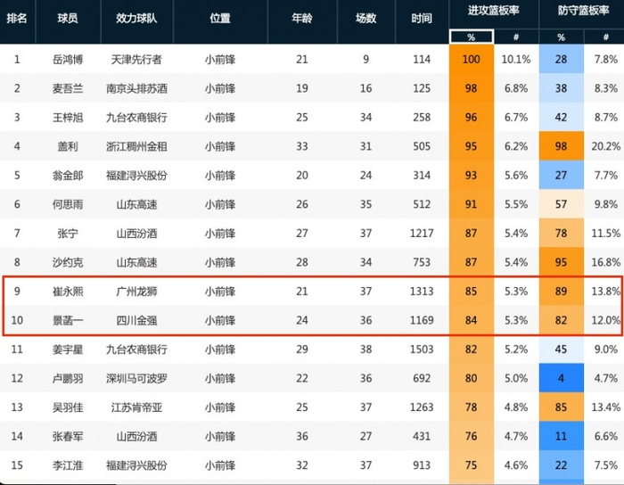 本土球员里只有崔永熙在两项数字上能做到比他更高,并且二者的差距并没有很大,这足以体现景菡一的身体素质和专注度。