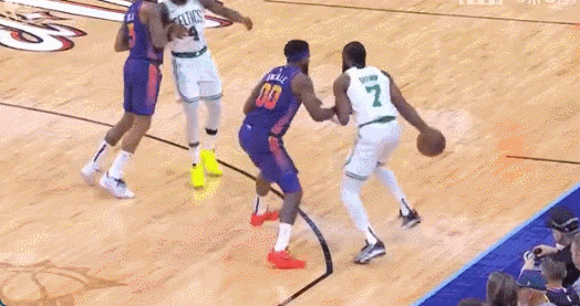 拉链战术执行时,你可以看到霍福德在切出至弧顶前,是挂了布朗在油漆区的下掩护——而拉链的持球人挂出时接受的掩护位置更偏向于底角。