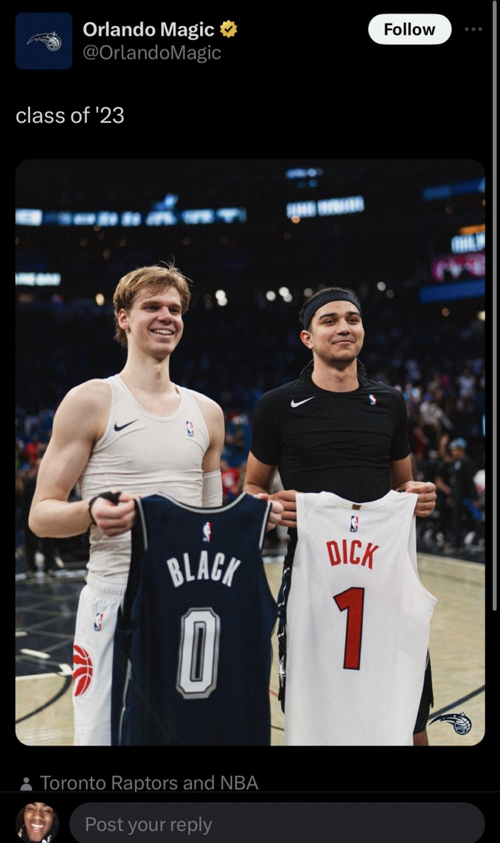在被问及此前为何选择与魔术后卫安东尼-布莱克交换球衣时,迪克笑着答道:“那是我兄弟。我和他在中学时期就经常一起打球或在场上作为对手,而关系要好的球员们往往会彼此交换球衣,他(布莱克)是我的朋友。”