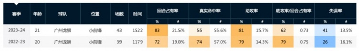 尽管失误率比上赛季要改善一些,但与全联盟横向比较,仍然是中等偏下的水平。在回合使用率前10的本土球员里,只有两个人的失误率要高于平均水平,一个是郭昊文,另一个则是小崔。