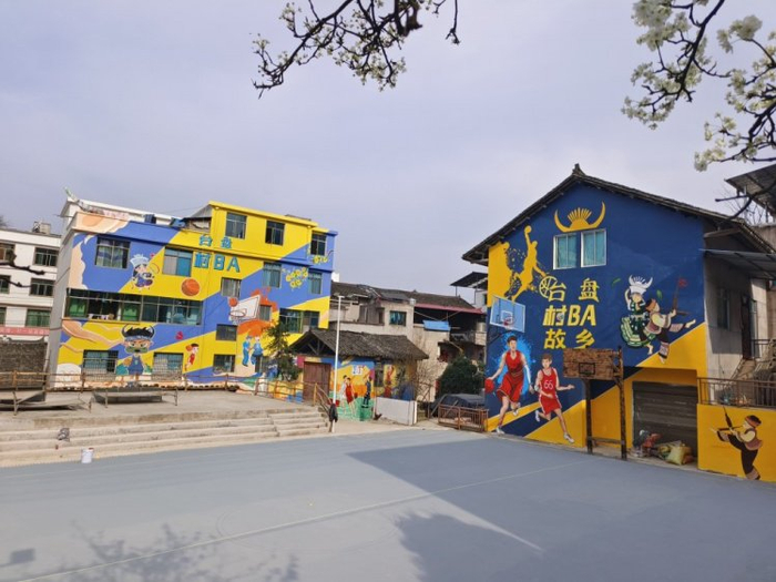球场旁三层楼高的LED屏幕,一年前就已霓虹闪烁;看台后侧刚建好的木屋中,展示着各种非物质文化遗产;台盘村最初的篮球场,两侧房屋满是“村BA”元素的涂鸦;路边的电线杆上,禁止无人机升空的标语与周遭的环境形成一种强烈的对比......