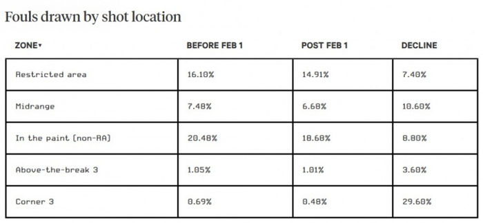 在两分球的范围里,总体降幅最大的是在“抛投区域”——也就是油漆区内的非限制区。而这与犯规率的下降相匹配,这再次暗示了(虽然没有直接证明出来),裁判员对“防守端的行动自由”方面的吹罚有了改变。