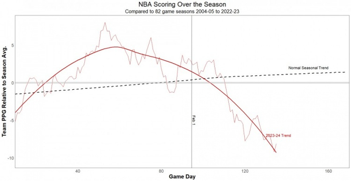 在今年大部分时间里的,比赛的场均得分都处于历史最高水准后,自2月初以来,联盟比赛的场均总得分有所下降。截至1月21日,每支队伍的场均总得分为115.6分(场均两队总分略低于231.2分),这是历史第六高的数据,也是自1969-70赛季以来的新高,而当时联盟的场均进攻回合比现在还要多20次。