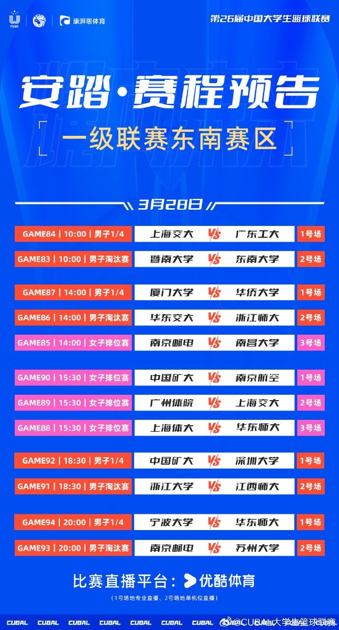 男篮方面明日白天将迎来上交vs广工与福建德比的焦点战,同时晚上新晋八强的深圳大学是否能够顶住矿式旋风的冲击?