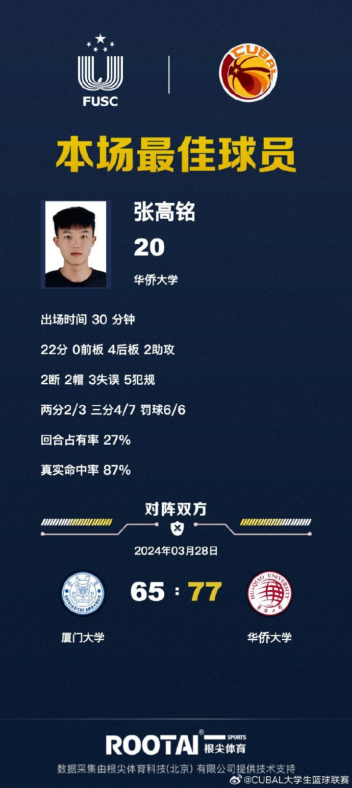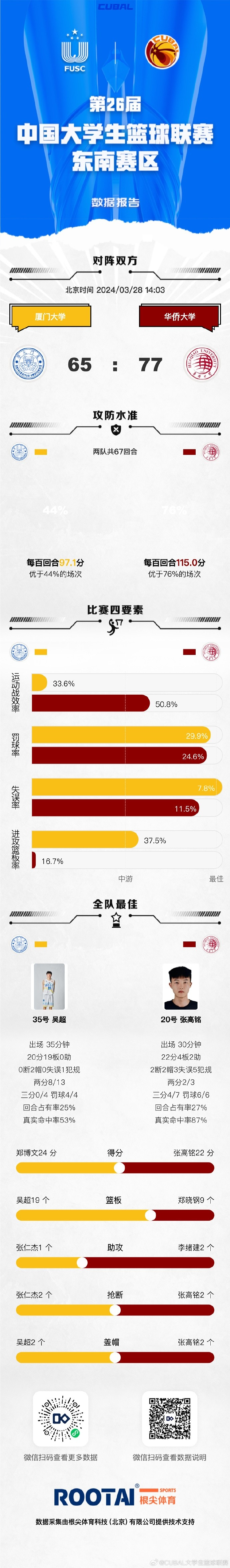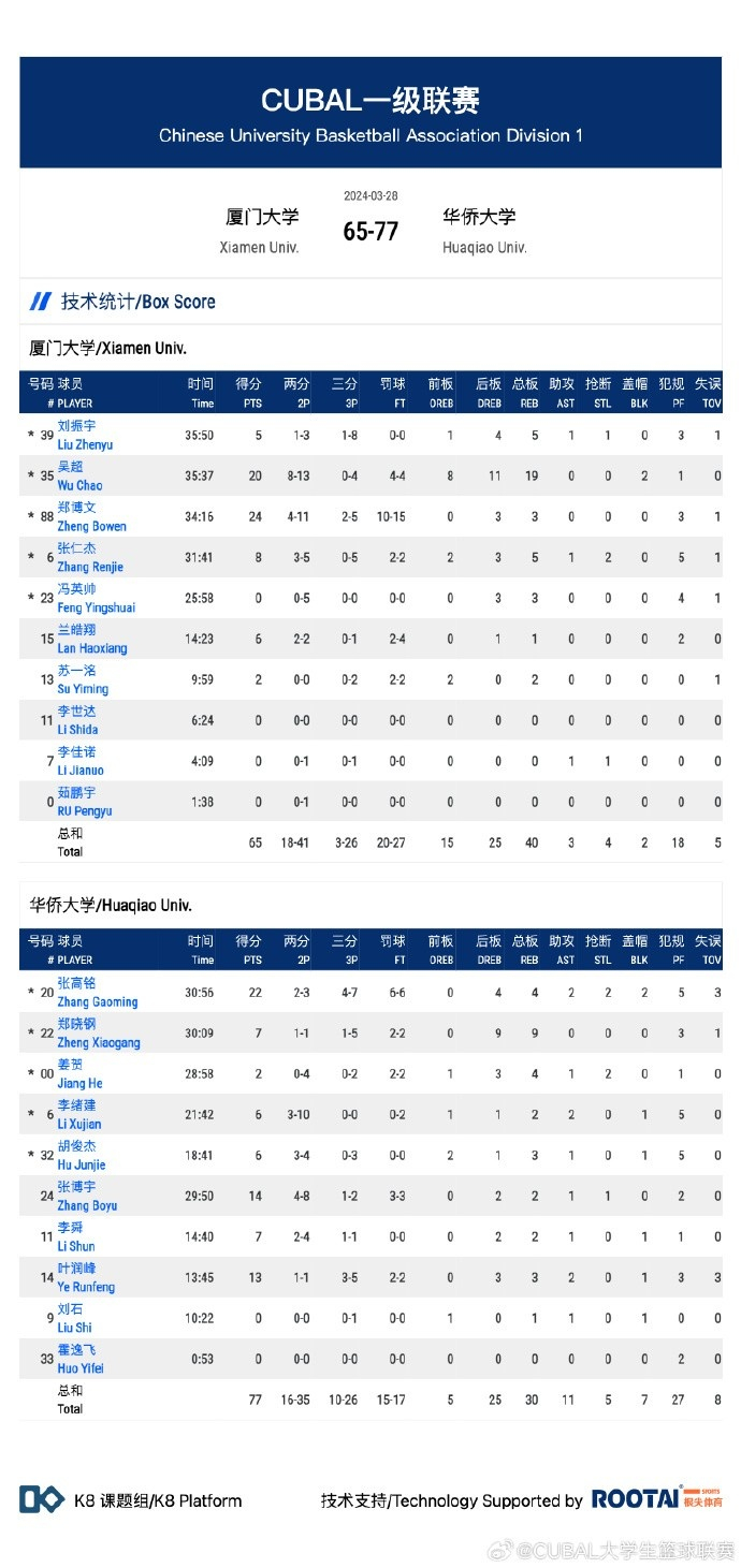 厦门大学:吴超20分19篮板、郑博文24分3篮板、刘振宇5分5篮板、张仁杰8分5篮板、兰皓翔6分、苏一洺2分2篮板。