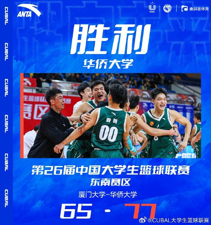 华侨大学:张高铭22分4篮板2助攻2抢断、张博宇14分2篮板、郑晓钢7分9篮板、李绪建6分2篮板2助攻、胡俊杰6分3篮板、叶润峰13分3篮板2助攻、李舜7分2篮板。