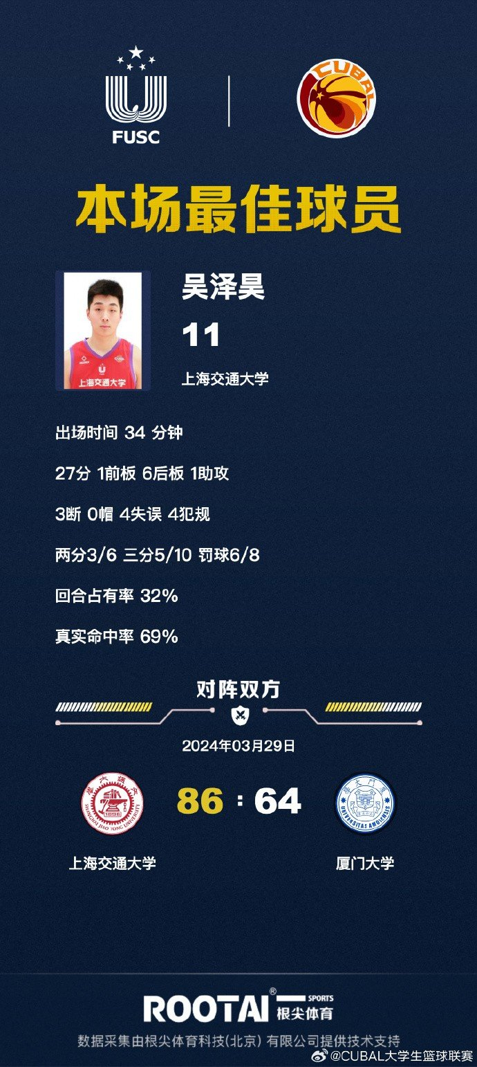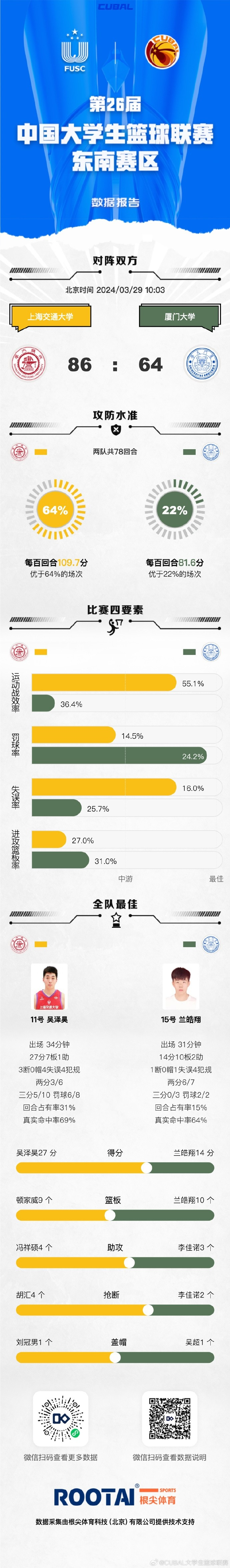 末节决战,兰皓翔篮下强打帮助厦门大学追分,但顿家威和冯祥硕又是接连三分强势回应,分差再次来到20分以上,李佳诺上篮被干扰球,冯英帅反击上篮也打成2+1,吴泽昊又接连两记三分止血回应,上海交大始终保持20分左右领先,刘冠男突破还能上篮命中,最终上海交大86-64战胜厦门大学。