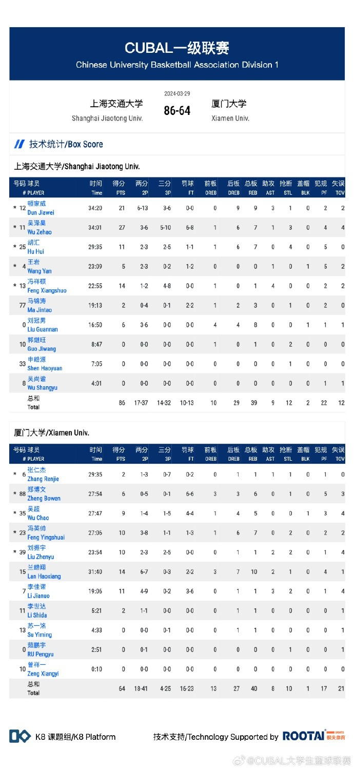 直播吧3月29日讯 CUBAL大学生联赛,上海交通大学对阵厦门大学。